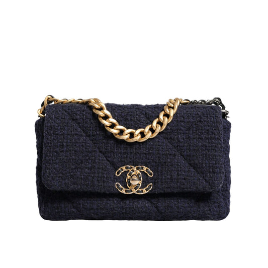 Chanel Dark Blue Medium Flap Tweed CC Gold Gray Chain Shoulder Bag