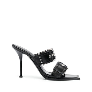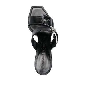 buckle-detail sandals from Alexander McQueen featuring black, calf leather, buckle detail at the toe, branded insole, high stiletto heel and square toe. Punk double buckle leather sandals Size and Fit - Heel 4,1 in / 10,5 cm; Platform 0,4 in / 1 cm