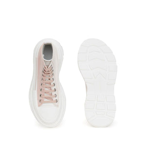 Tread Slick high-top sneakers from Alexander McQueen featuring light pink, cotton, logo-print tongue, embroidered logo to the rear, contrasting toecap, round toe, front lace-up fastening, ankle-length, branded insole and platform sole. Tread Slick ankle boots Size and Fit - Platform 1,8 in / 4,5 cm