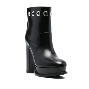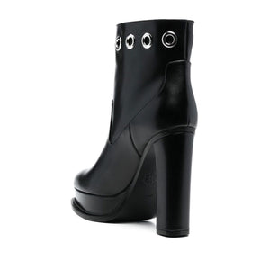 130mm platform-sole eyelet boots from Alexander McQueen featuring black, calf leather, almond toe, eyelet detailing, ankle-length, platform sole and high block heel. Leather heel ankle boots Size and Fit - Heel 5,1 in / 13 cm; Platform 1 in / 2,5 cm