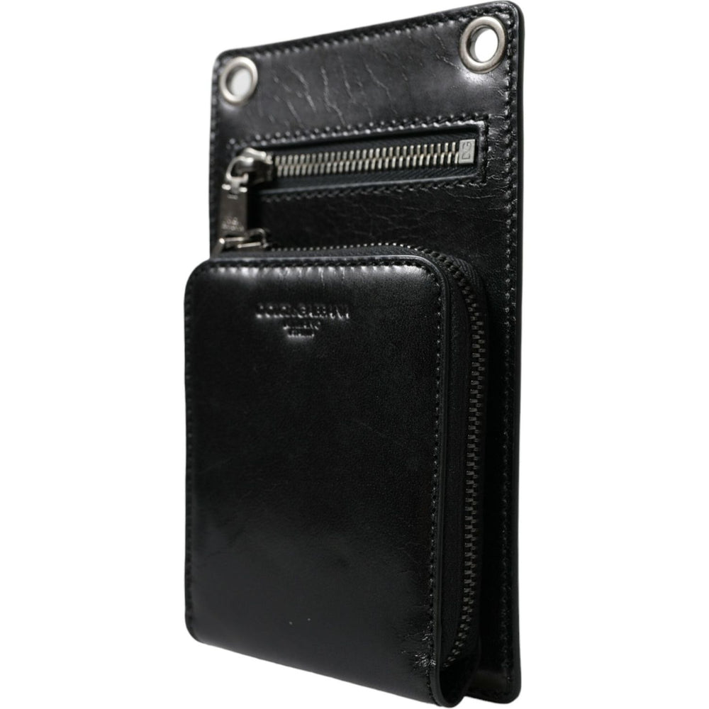 محفظة دولتشي آند غابانا من جلد العجل الأسود مع حزام للكتف والرقبة وسحاب وشعار