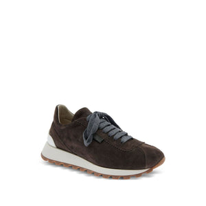 dark brown padded collar contrasting laces rubber sole embossed logo detail Suede leather sneakers Size and Fit - Heel 3 cm
