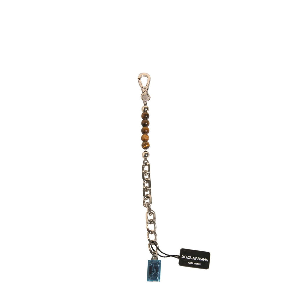 Dolce & Gabbana Silver Brass Chain Beaded Logo Plaque Keychain Keyring