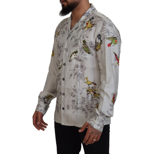 Dolce & Gabbana White Bird Print Silk Satin Casual Shirt