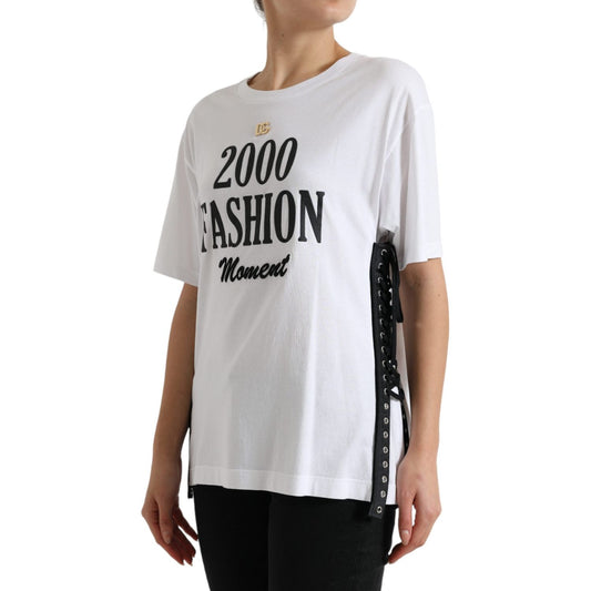 Dolce & Gabbana White Slogan Print Lacing Detailed T-shirt