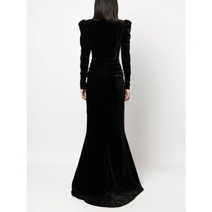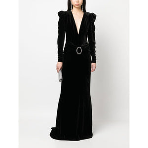 belted velvet V-neck gown from ALESSANDRA RICH featuring black, velvet, plunging V-neck, drop waist, belted waist, long sleeves, crystal embellishment, floor-length and ruched detailing. Deep neckline velvet long dress Size and Fit - This piece fits true to size. We recommend you get your regular size. Model is 1,75m / 5ft 8in wearing size 40 (IT)