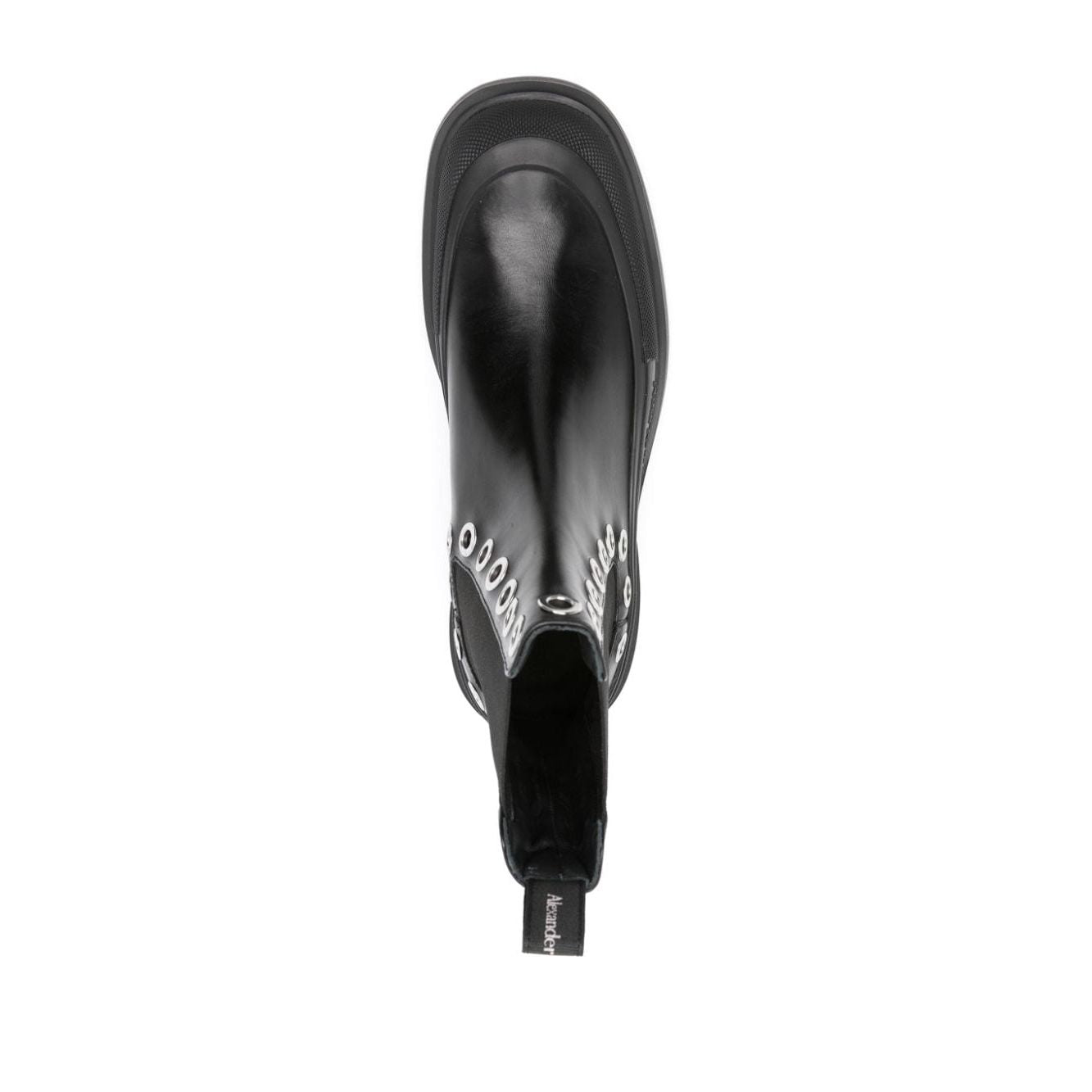 eyelet-detail Chelsea boots from Alexander McQueen featuring jet black, silver-tone hardware, metal eyelet detailing, logo pull-tab at the heel, elasticated side panels, round toe, chunky rubber sole and pull-on style. Tread Slick leather chelsea boots Size and Fit - Heel 2 in / 5 cm