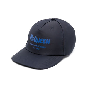 Graffiti-print baseball cap from Alexander McQueen featuring navy blue, cotton, signature Graffiti print, logo print to the front, five-panel construction, curved peak and adjustable strap to the rear. Logo baseball cap Size and Fit - BRIM: 7.2 Centimetres. CIRCUMFERENCE: 55.5 Centimetres.