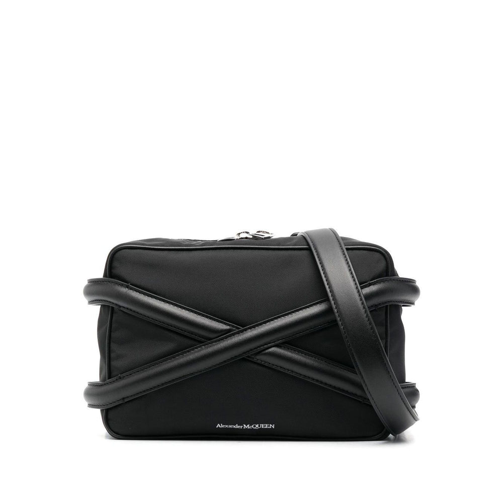 The Harness camera bag from Alexander McQueen featuring black, leather trim, logo print to the front, silver-tone hardware, two-way zip fastening, adjustable detachable shoulder strap, slip pocket to the rear, internal slip pocket and full lining. Harness nylon camera bag Size and Fit - Width 8,66 in / 22 cm