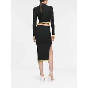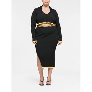 x Ester Manas ribbed cropped cardigan from AZ FACTORY featuring black, ribbed knit, V-neck, spread collar, front button fastening, long sleeves, contrasting border, scallop hem and cropped. Cropped top Size and Fit - This piece fits true to size. We recommend you get your regular size. Model is 1,75m / 5ft 8in wearing size S