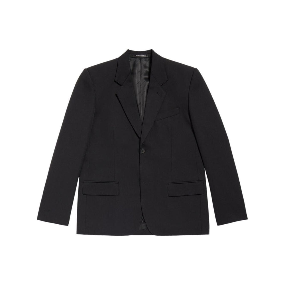 single-breasted wool blazer from BALENCIAGA featuring black, wool, notched lapels, shoulder pads, long sleeves, buttoned cuffs, front button fastening, chest welt pocket, two side flap pockets and straight hem. Wool single-breasted blazer jacket Size and Fit - This piece fits true to size. We recommend you get your regular size. Model is 1,84m / 6ft 1in wearing size M