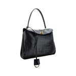 Leather Medium Rodeo Handbag by Balenciaga, single removable top handle, charm with key ring detail applied at base of handle, dual compartment, flap closure with swivel system at front, crocodile-effect leather design, double welt pocket on back panel.