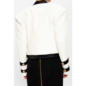 Elevate your ensemble with the quintessentially chic Balmain classic white blazer. A statement piece that exudes sophistication, this blazer features standout faux gold buttons that add a touch of opulence to any outfit. Perfectly tailored to showcase your silhouette, it’s a must-have for the fashion-forward individual. Indulge in the elegance of French design and superior craftsmanship that Balmain is celebrated for.