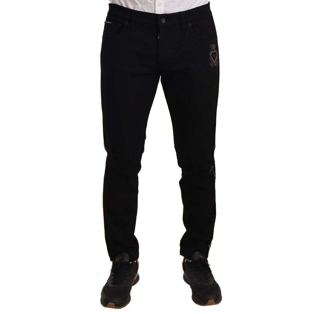Gorgeous brand new with tags, 100% Authentic Dolce & Gabbana black jeans with the iconic heraldic embroidery on the back pocket made with thread and shimmering beads. Crafted from cotton stretch features slim fit with button and zip closure.