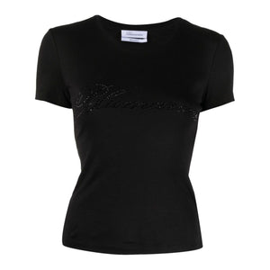 logo-embellishment cotton T-shirt from BLUMARINE featuring black, cotton, logo embellishment, crew neck, short sleeves and straight hem. Logo cotton t-shirt Size and Fit - This piece fits true to size. We recommend you get your regular size. Model is 1,75m / 5ft 8in wearing size S