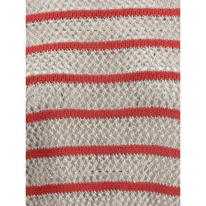The linen Sweater by Brunello Cucinelli is an elegant and sophisticated piece, featuring a ribbed crew neck that adds a touch of refined simplicity. The openwork knit design with all-over shiny sequin details adds brightness and a touch of glamour. The wide three-quarter sleeves create a soft and fluid effect, while the ribbed cuffs and hem ensure a comfortable and well-defined fit. The loose fit gives the sweater a relaxed yet elegant look, making it ideal for sophisticated yet comfortable looks.