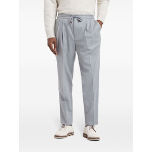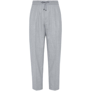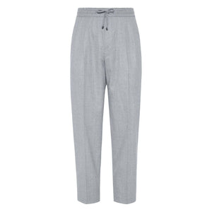 beluga grey virgin wool pressed crease elasticated drawstring waistband two side slit pockets two rear jetted pockets tapered leg Wool trousers