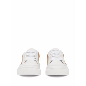optic white/archive beige calf leather Vintage Check pattern panelled design front lace-up fastening round toe branded heel counter flat rubber sole Check leather sneakers Size and Fit - Heel 0,8 in / 2 cm