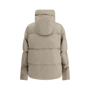 The Down jacket by Golden Goose made of nylon with tonal logo appliqué on the sleeve features a drawstring hood, zipper closure, front zipper pockets and lined interior with mesh pockets, completed with adjustable drawstring at the bottom.