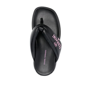 quilted flatform flip flops from CHIARA FERRAGNI featuring black, embroidered logo, single toe strap, quilted, flatform sole and slip-on style. CF Platform flip flops Size and Fit - Heel 2 in / 5 cm; Platform 1,4 in / 3,5 cm