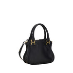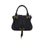 Calfskin Marcie Handbag by Chloé, double rigid leather top handle, removable and adjustable leather shoulder strap, top zipper closure, front flap with iconic leather tassel detail, iconic brand monogram press-stamped on front, open front pocket hidden by flap, single interior compartment.