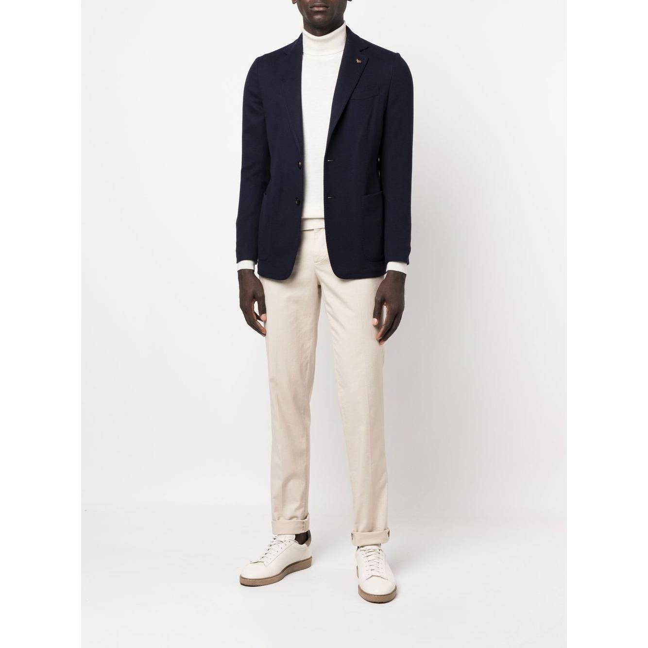 single-breasted wool blazer from COLOMBO featuring navy blue, wool, notched lapels, front button fastening, chest welt pocket, two front patch pockets, long sleeves, buttoned cuffs, English rear vents and straight hem. Wool single-breasted jacket Size and Fit - This piece fits true to size. We recommend you get your regular size. Model is 1,84m / 6ft 1in wearing size 48 (IT)