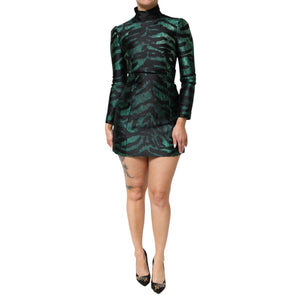 Gorgeous brand new with tags, 100% Authentic Dolce & Gabbana dress. This elegant mini dress is crafted in a striking black and green metallic jacquard pattern with a structured silhouette, long sleeves, and a chic high neckline. Perfect for evening occasions and statement looks.