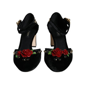 Dolce & Gabbana Black Velvet Roses Ankle Strap Pumps Shoes