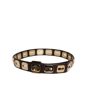 Gorgeous brand new, 100% Authentic Dolce & Gabbana belt, specifically a dark brown leather belt featuring gold-tone hardware. The belt’s design incorporates square-shaped links with a unique closure mechanism at the front. The closure consists of a rotating, ring-shaped element that interlocks with the adjacent link.