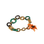 Gorgeous brand new with tags and box, 100% Authentic Dolce & Gabbana necklace with an orange resin lily at the nape. It’s made in Italy from a gold-tone metal chain that’s accented by marbled-green and brown wooden links.
