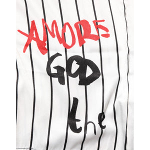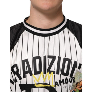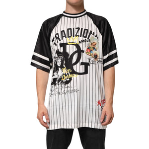 Gorgeous brand new, 100% Authentic Dolce & Gabbana T-shirt “Tradizione” oversized T-shirt from the men’s collection. Designed in a baseball jersey-inspired silhouette, this shirt features a striking pinstripe pattern contrasted by black raglan sleeves with sporty stripes. The front is decorated with vibrant, artistic graffiti-style graphics including the signature DG logo, religious and romantic imagery, and expressive text such as “Tradizione”, “Mon Amour”, “Amore”, and “God the”.