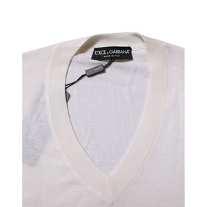 Dolce & Gabbana White Cashmere Logo V-neck Pullover Sweater