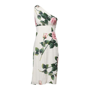 Dolce & Gabbana White Floral One Shoulder Sheath Midi Dress