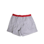 Crafted from soft cotton with a striped white and grey pattern, featuring a bold red elastic waistband with logo detail.