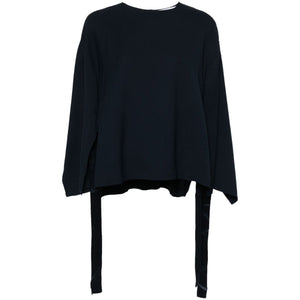 navy blue cady texture crew neck drop shoulder long open wide sleeves open sides straight hem side tie fastening single rear button fastening Cady texture blouse Size and Fit - This piece fits true to size. We recommend you get your regular size. Model is 1,75m / 5ft 8in wearing size 40 (IT)
