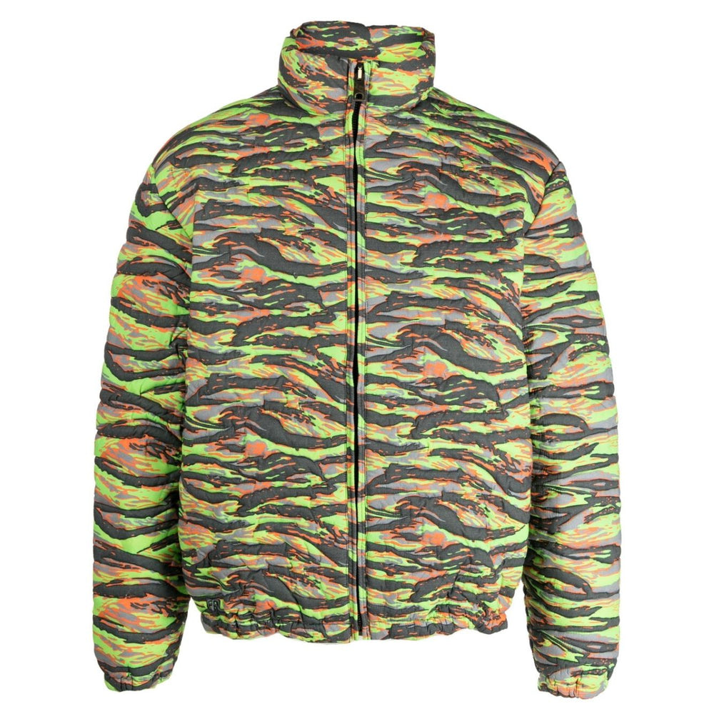 camouflage jacquard padded jacket from ERL featuring light green, multicolour, duck feather, duck down, cotton, full jacquard, camouflage print, high neck, front zip fastening, long sleeves and straight hem. Printed quilted down jacket Size and Fit - This piece fits true to size. We recommend you get your regular size. Model is 1,84m / 6ft 1in wearing size M