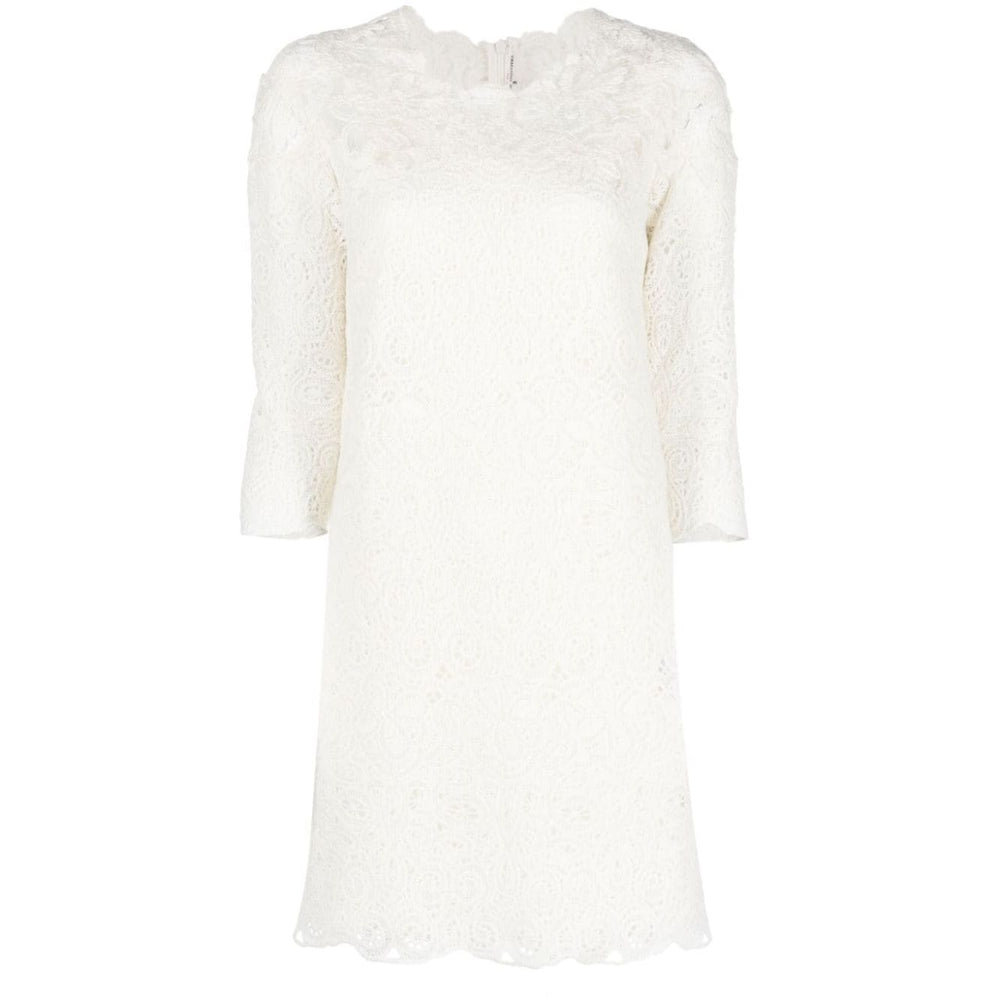 guipure lace shift minidress from ERMANNO SCERVINO featuring chalk white, guipure lace, scallop edge, shift style, round neck, rear zip fastening, three-quarter length sleeves, internal slip dress and thigh-length. Wool blend short dress Size and Fit - This piece fits true to size. We recommend you get your regular size. Model is 1,75m / 5ft 8in wearing size 40 (IT)