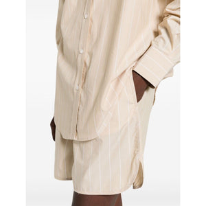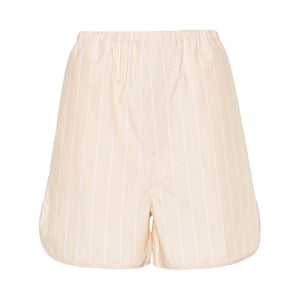 beige/white organic cotton poplin texture vertical stripe pattern elasticated waistband two side slit pockets rear welt pocket curved hem thigh-length This item is made from at least 50% organic materials. Learn more about what makes a product Conscious on our Conscious Criteria page Striped drawstring shorts Size and Fit - This piece fits true to size. We recommend you get your regular size. Model is 1,75m / 5ft 8in wearing size 36 (FR)