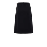 Removable fabric belt with gold logo buckle at the waist. Long central zip with latex detail, two pockets on the sides with visible zip. Medium length model, slightly flared, stretch fabric.