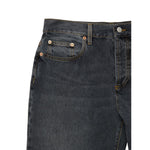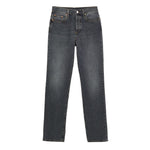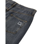 In dark gray washed denim, button opening, five pockets, regular fit. On the back pocket Gucci logo in crystals