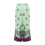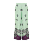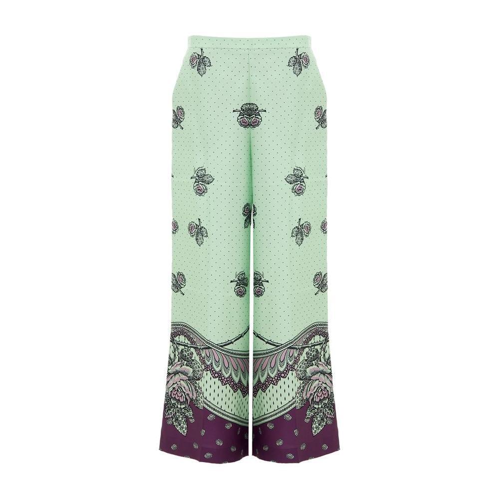 Gucci Print Silk Palazzo Pants. In aqua green and purple, with contrasting polka dots and flower print. Side zip opening, no button, two side welt pockets, wide leg.