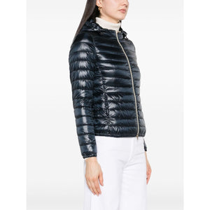 navy blue feather down padded design quilted gold-tone logo plaque logo-engraved gold-tone hardware detachable drawstring hood front two-way zip fastening long sleeves elasticated cuffs two side zip-fastening pockets elasticated hem quilted lining Nylon short down jacket Size and Fit - This piece fits true to size. We recommend you get your regular size. Model is 1,75m / 5ft 8in wearing size 40 (IT)