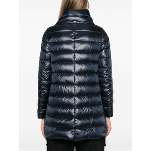 navy blue feather down high-shine finish quilted funnel neck press-stud fastening long sleeves two handwarmer pockets straight hem Ameli midi down jacket