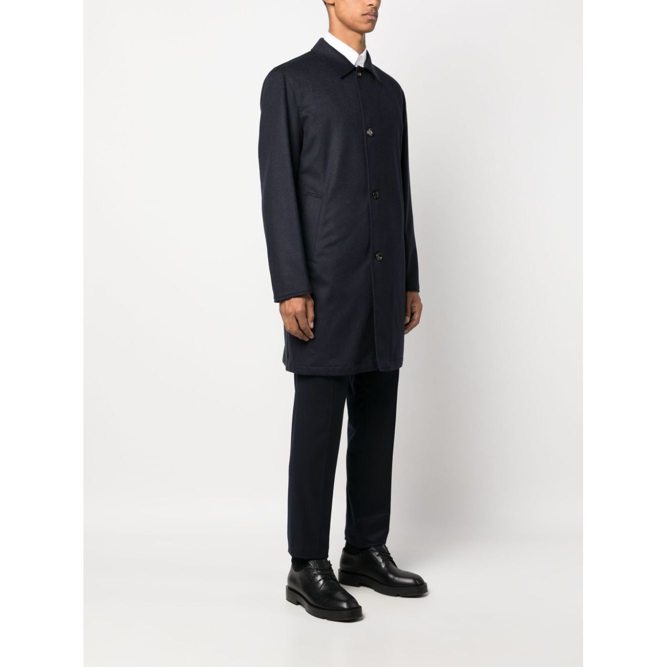 navy blue cashmere spread collar front button fastening long sleeves thigh-length straight hem Peak cashmere coat Size and Fit - This piece fits true to size. We recommend you get your regular size<br>Model is 1,84m / 6ft 1in wearing size 48 (IT).