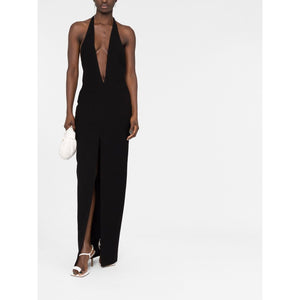 plunging V-neck low-back dress from Monot featuring black, halterneck, plunging V-neck, low back, front slit and sleeveless. Silk crepe long dress Size and Fit - This piece fits true to size. We recommend you get your regular size. Model is 1,75m / 5ft 8in wearing size 4 (US)