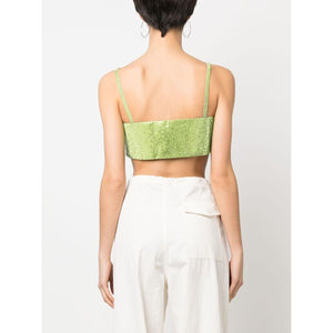 rhinestone-embellished silk crop top from Nuè featuring sage green, silk, rhinestone embellishment, square neck, thin straps, square open back, cropped and straight hem. Crystal detail cropped top Size and Fit - This piece fits true to size. We recommend you get your regular size. Model is 1,75m / 5ft 8in wearing size S