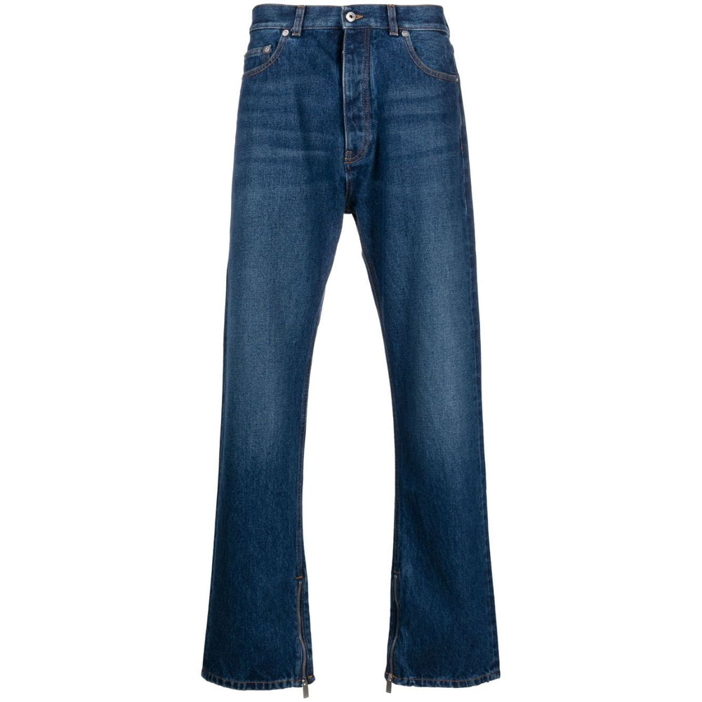 high-waist straight-leg jeans from OFF-WHITE featuring indigo blue, cotton, denim, logo patch to the rear, high-waisted, belt loops, straight leg, front button fastening, classic five pockets and ankle zips. Skate denim jeans Size and Fit - This piece fits true to size. We recommend you get your regular size. Model is 1,84m / 6ft 1in wearing size 32 (WAIST CM)