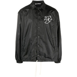logo-patch lightweight jacket from PALM ANGELS featuring logo patch at the chest, logo patch to the rear, front button fastening, long sleeves, elasticated cuffs, two side welt pockets, straight hem, black and classic collar. Printed coach jacket Size and Fit - This piece fits true to size. We recommend you get your regular size. Model is 1,84m / 6ft 1in wearing size M