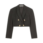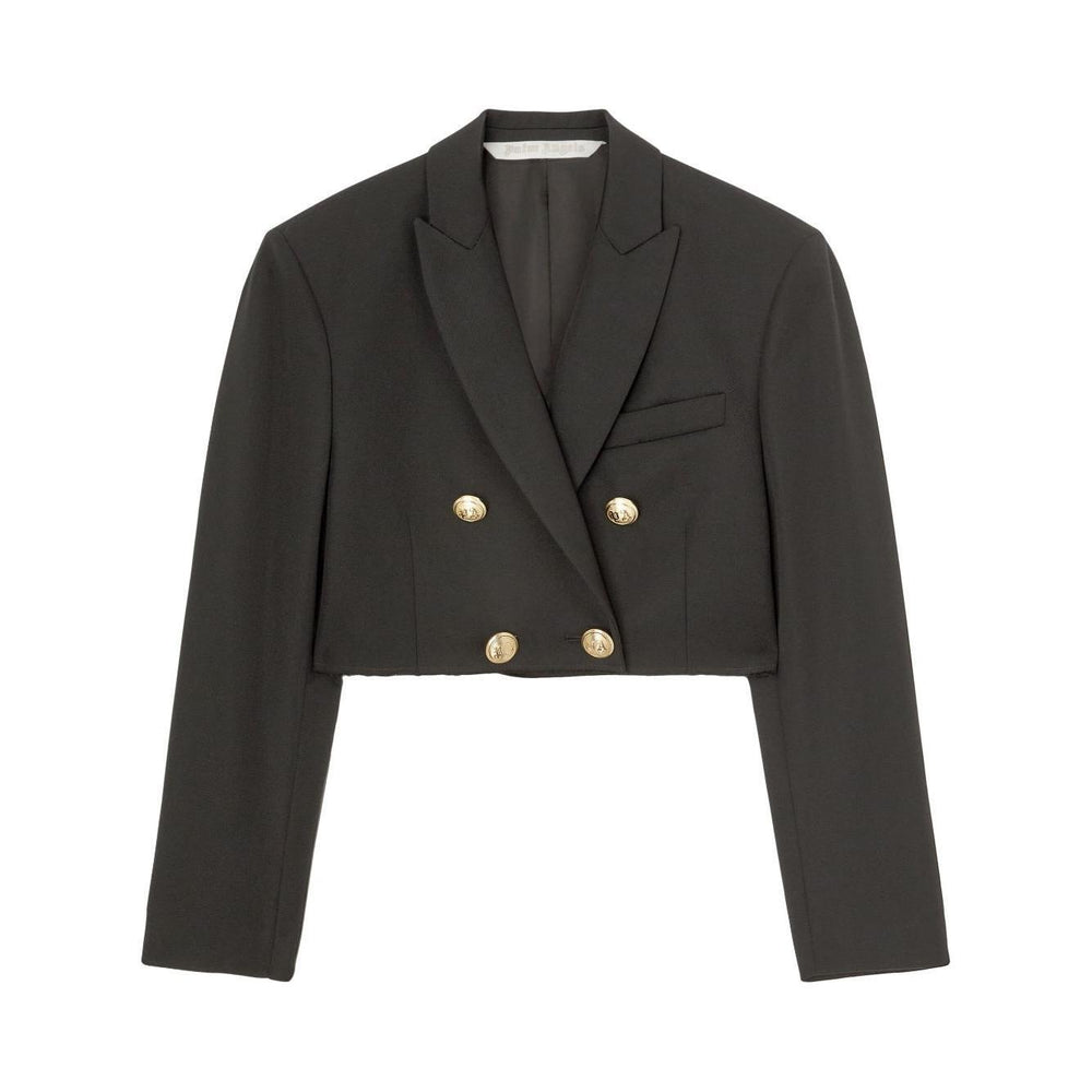 cropped double-breasted blazer from PALM ANGELS featuring black, virgin wool blend, peak lapels, chest welt pocket, embossed gold-tone buttons, cropped and straight hem. Cropped blazer Size and Fit - This piece fits true to size. We recommend you get your regular size<br>Model is 1,75m / 5ft 8in wearing size 40 (IT).