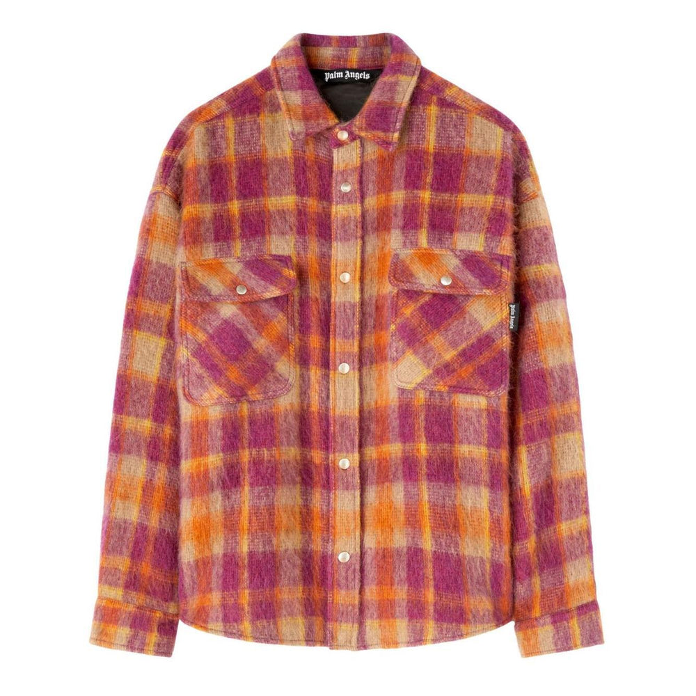 plaid-print shirt jacket from PALM ANGELS featuring orange, multicolour, virgin wool blend, logo patch at the chest, plaid check print, classic collar, front press-stud fastening, chest flap pockets, long sleeves, press-stud fastening cuffs and curved hem. Checked wool overshirt Size and Fit - This piece fits true to size. We recommend you get your regular size. Model is 1,84m / 6ft 1in wearing size 48 (IT)